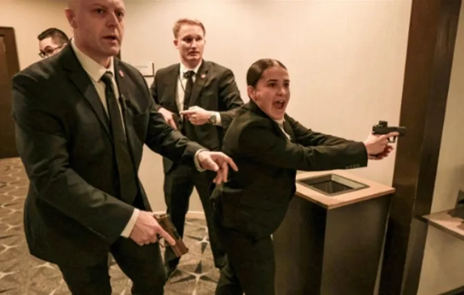 白宫记协晚宴枪击案发生后,安全人员急忙冲入现场。影片截图
