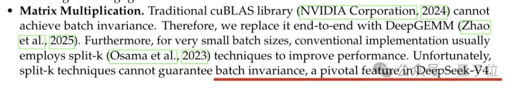矩阵乘法方面,V4在大多数场景中放弃split-K,转而做更受约束的 batch-invariant GEMM。他们用自研DeepGEMM替代了通用的cuBLAS。