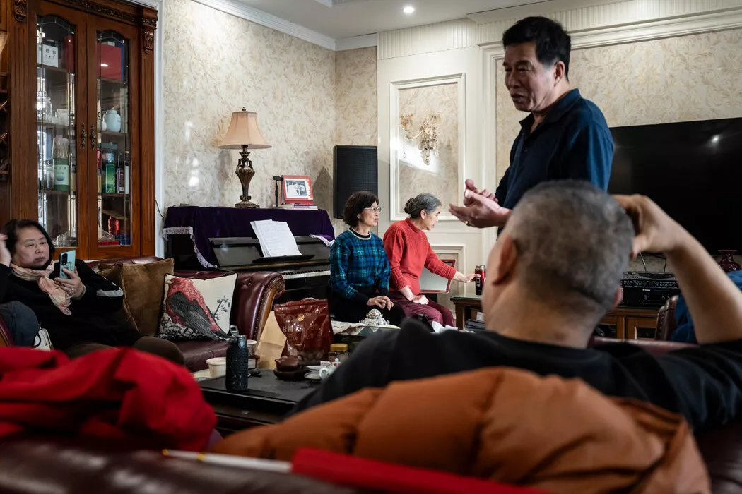 卫肖扬与业主委员会成员在复核议程。Qilai Shen for The New York Times