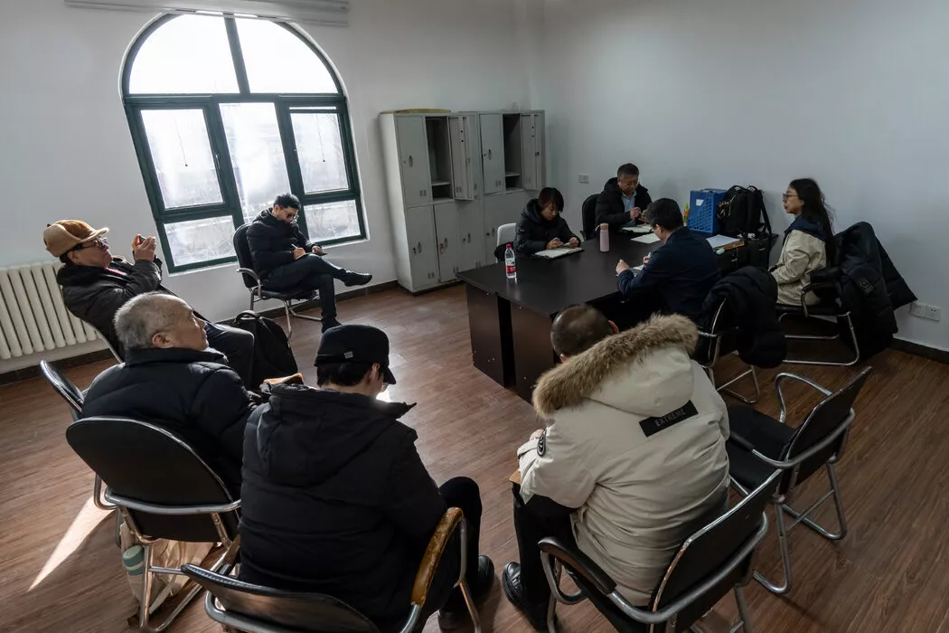 拿着手机的柳信中和在他右侧的贺树忠以及其他人正与当地政府举行仲裁会议。Qilai Shen for The New York Times