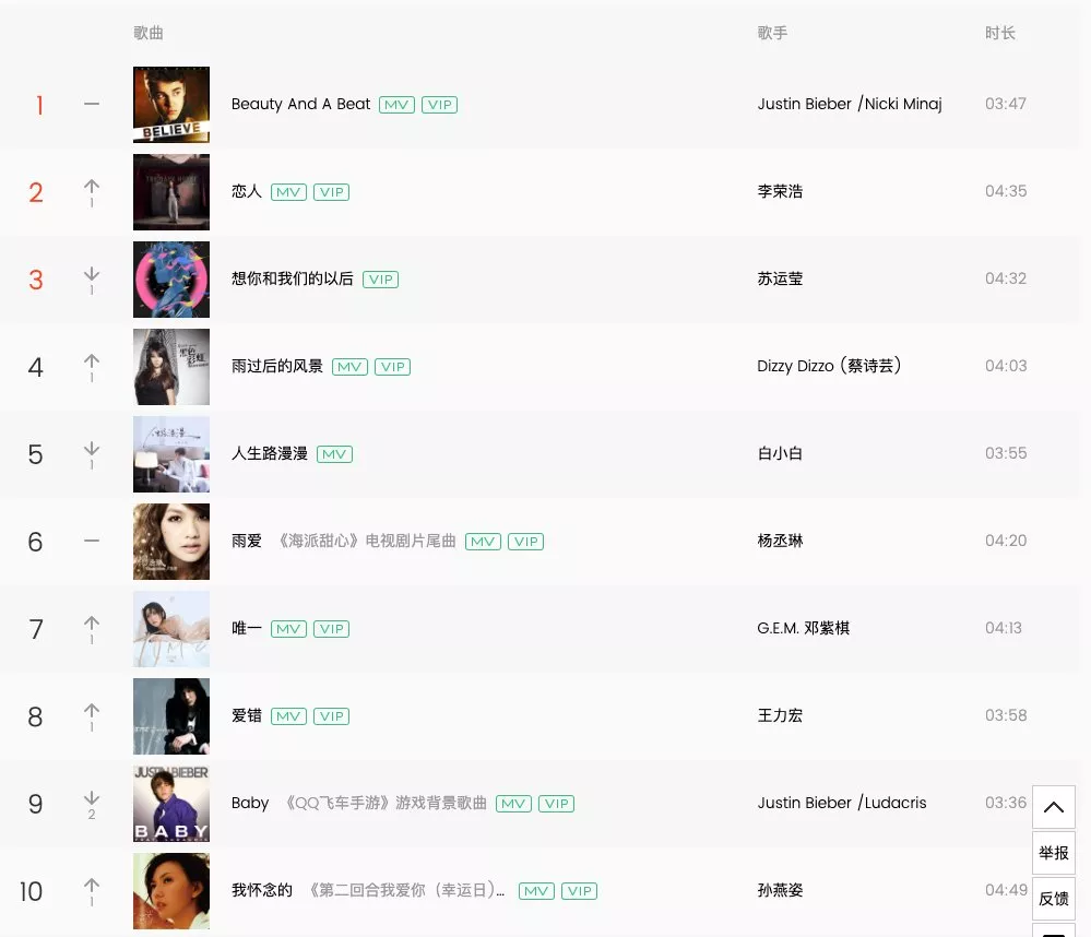 带着这样的好奇我打开QQ音乐的热歌榜(每日更新的站内播放量前300首),前10首歌里有6首都是历史超过10年以上的歌曲,剩下4首里2首也是老歌的翻唱。