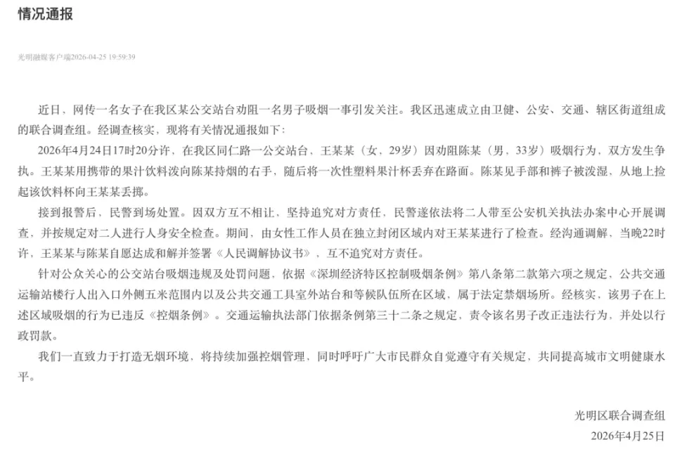 对于前一起事件,深圳警方已发布通报,在公交站台吸烟、损害路人权益的陈某被处以罚款;