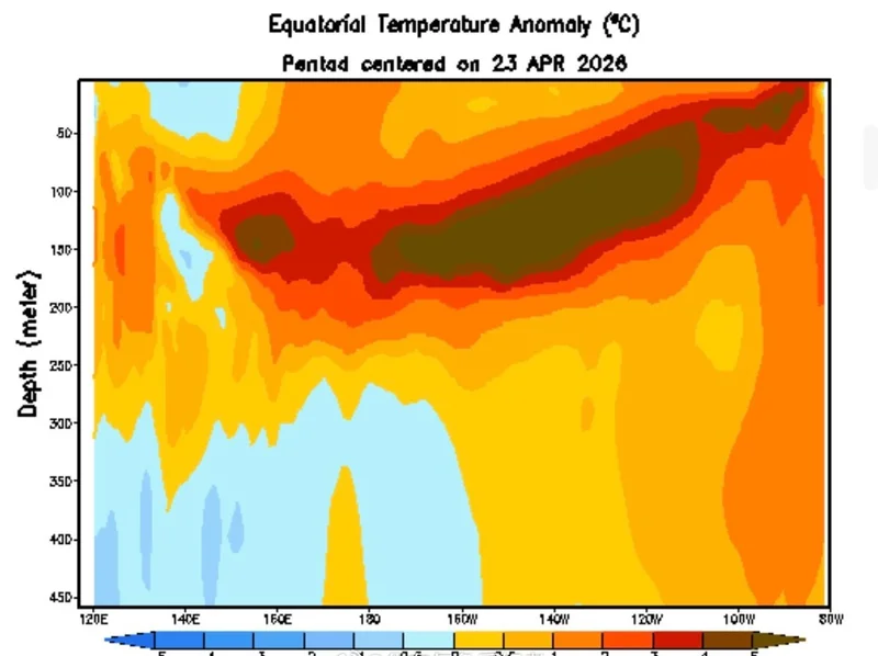真正让人坐不住的是海洋深处的动向:赤道太平洋次表层出现了大范围暖水,在海平面以下150米处,甚至存在正5到正6摄氏度的深厚暖核。