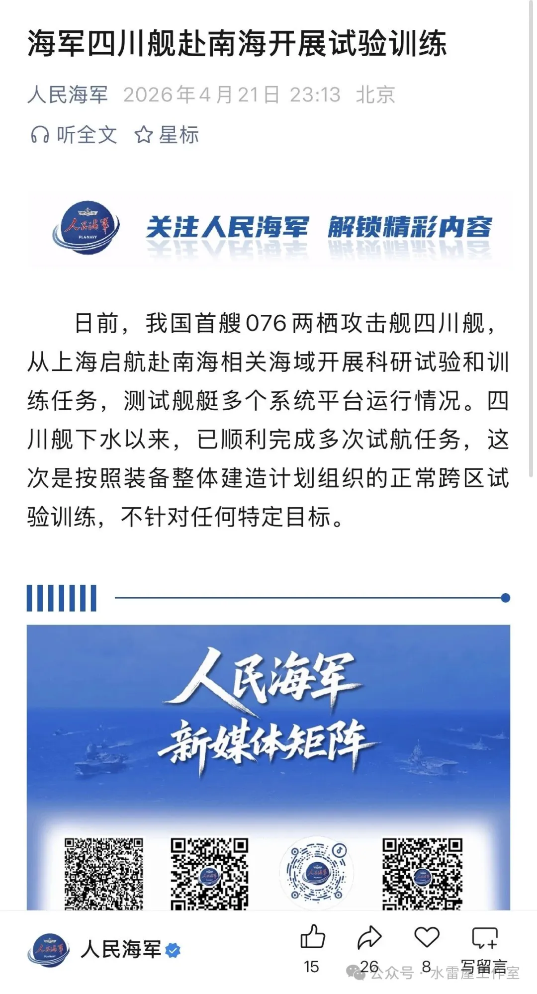 前几天一直在关注海军成立纪念日以及开放活动的相关信息,没来得及讲关于076新一轮出海试验。