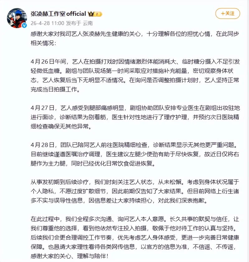 感谢大家对我司艺人张凌赫先生健康的关心,十分理解各位的担忧心情,在此同步相关情况: