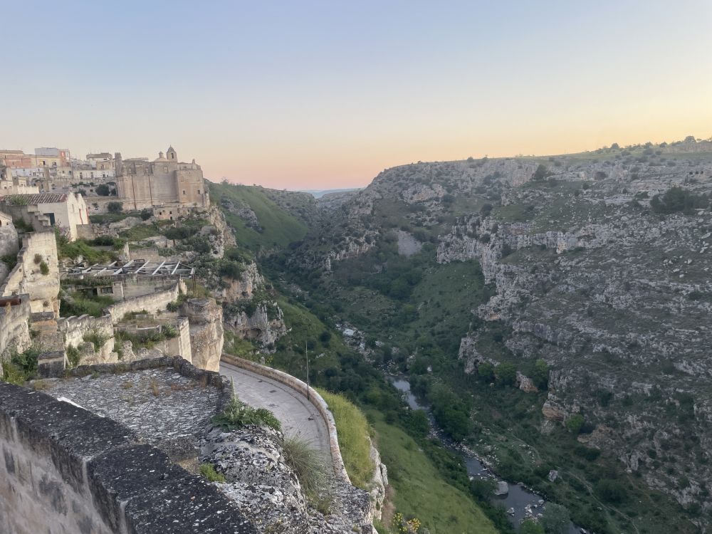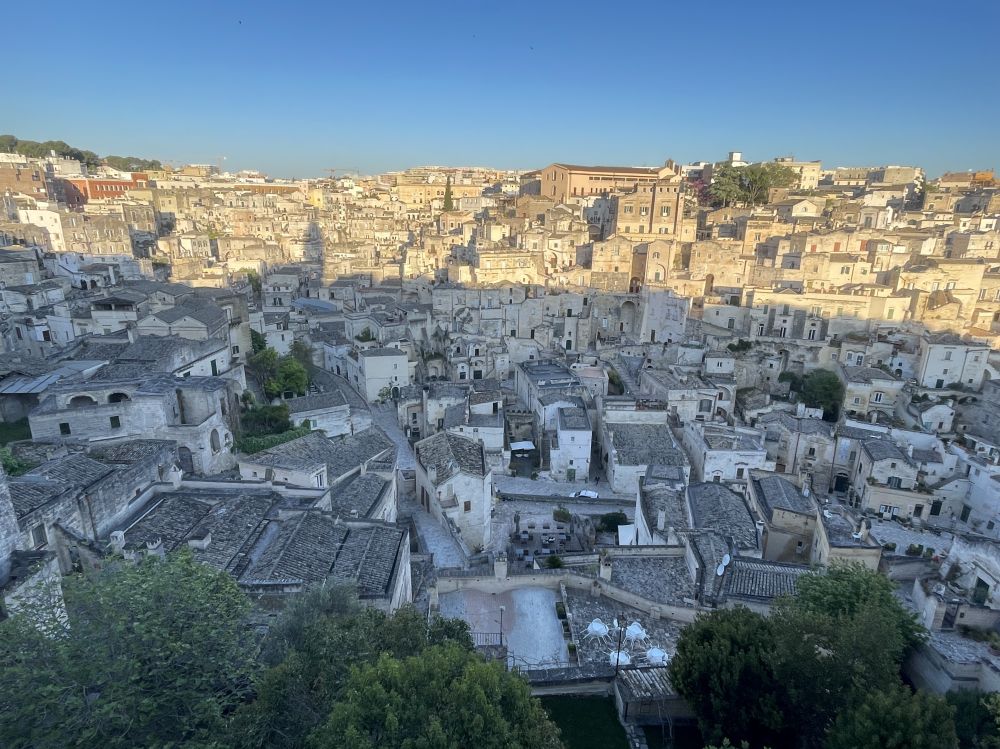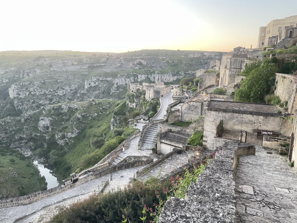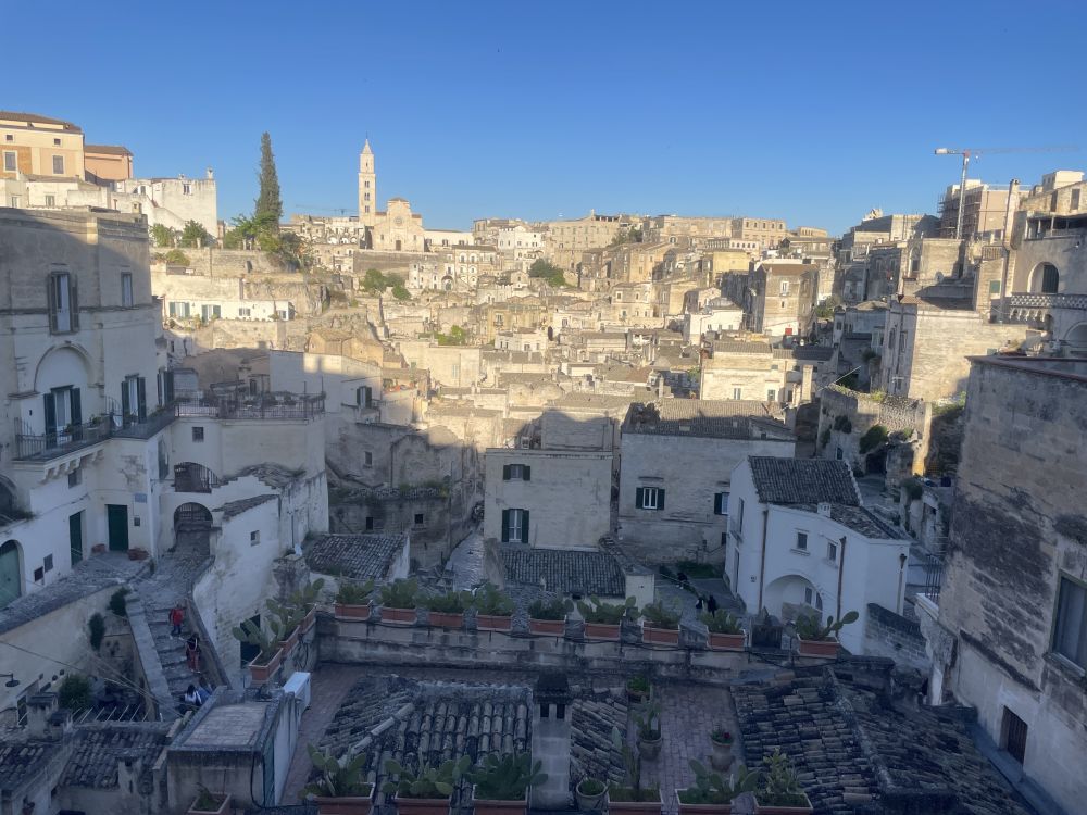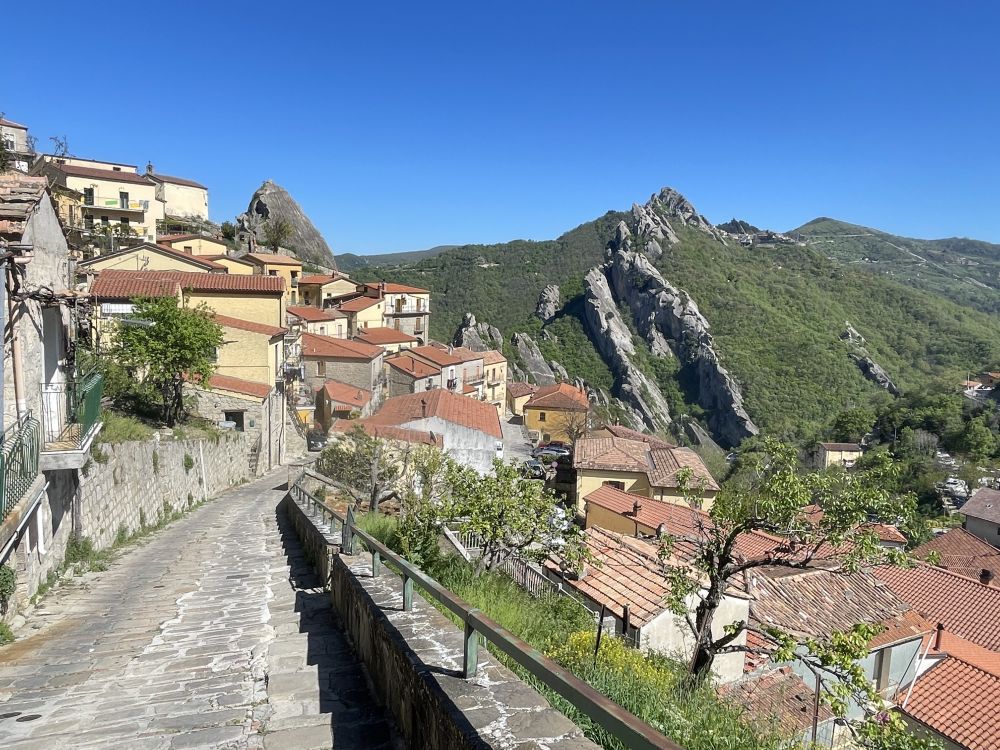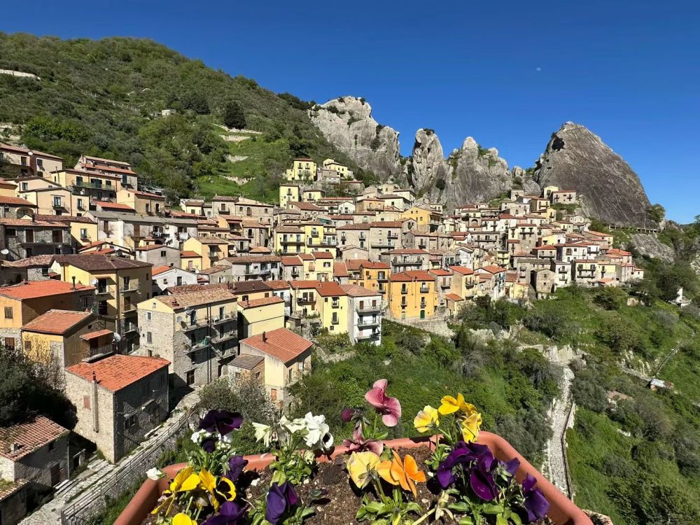 开车去马泰拉顺路,有风景如画的三座小山村,其中一座Castelmezzano,意思是中间的城堡。小村在山顶几块巨石下,黄墙红瓦,非常上镜。穿过曲折小巷到教堂前广场,最佳观景台,拍照打卡。