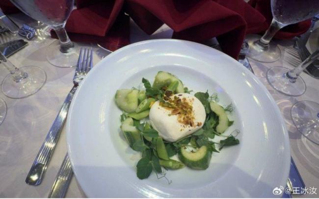 王冰汝在微博发了一张沙拉图,配文:“一个人500刀(美元)的白宫记者晚宴,就上了个沙拉,说好的龙虾呢?”(取材自微博)
