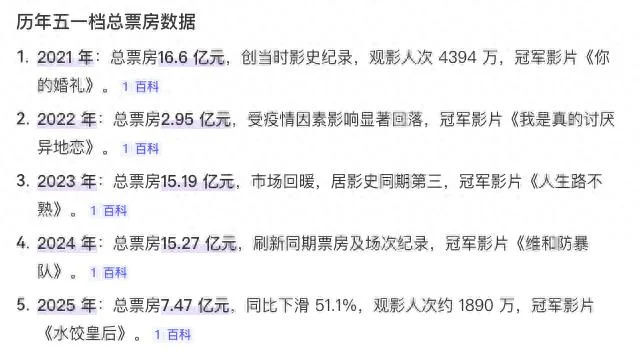 以行业客观视角来看,2026年五一票房有很大概率比不上去年,即便能超过去年也很有限。猫眼专业版统计,去年五一7.47亿已是近十年来除疫情期间外最差的五一档了,比起2021年16亿+的档期高峰,差距不是一般大。
