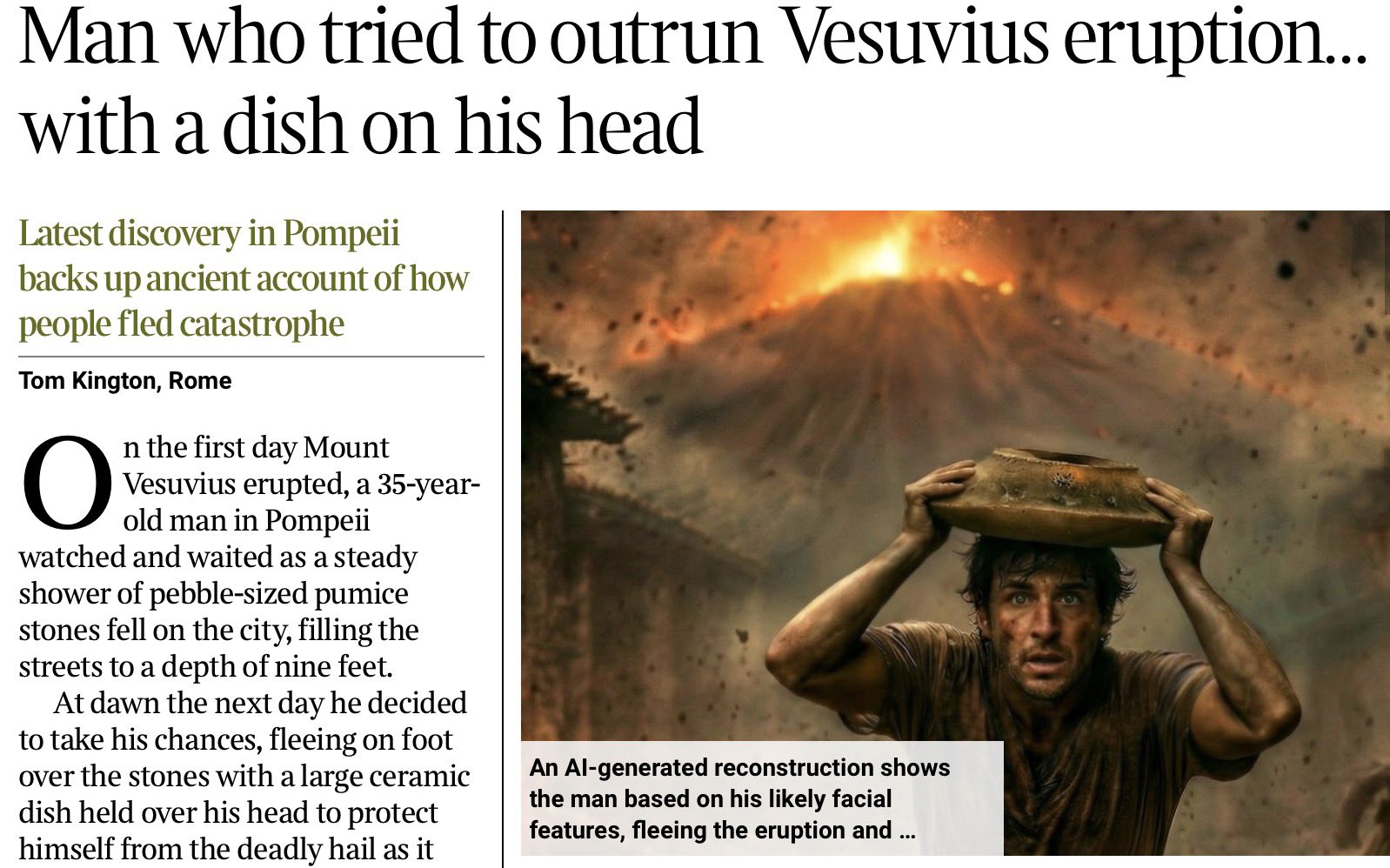 AI重建的影像中,这名男子在布满碎石的道路上急忙逃跑,手上举着一个宽而浅的大碗,保护他的头部,背景则是正在喷发的维苏威火山,火山灰冲天,碎屑四散。