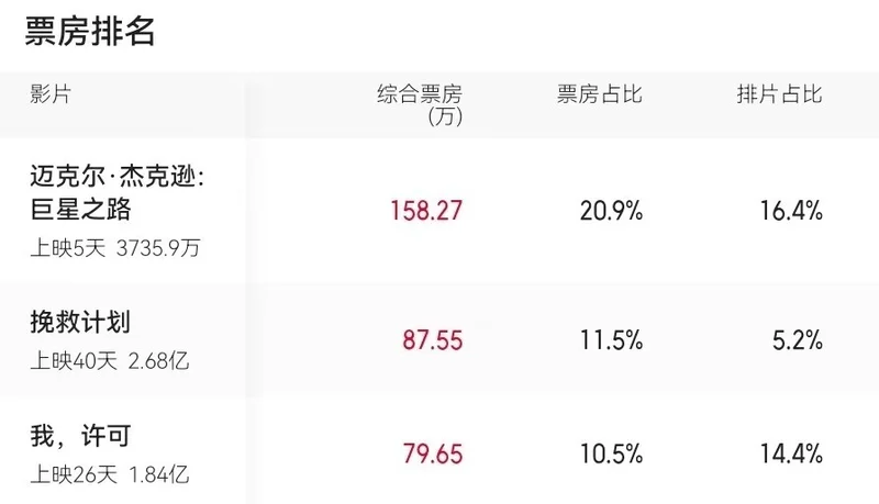 因此,《巨星之路》仅仅只是超越了上映20多天的《我,许可》以及上映40天的《挽救计划》等作品。