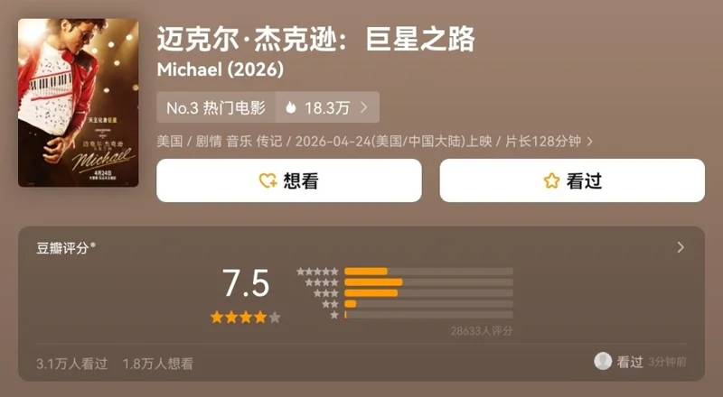 国内口碑评分7.5,而熟悉迈克尔·杰克逊的观众,也大都是80后和90后。