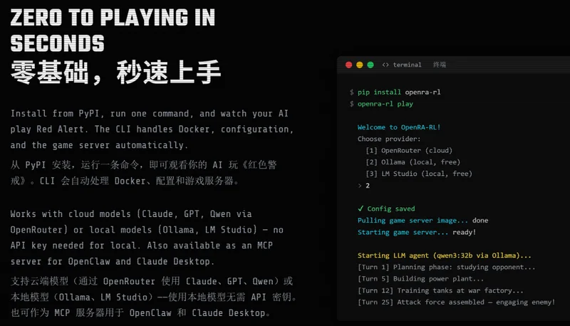 而现在,开源社区第一次把 RTS Agent 训练的门槛一脚踹到了地上——一台消费级显卡,一行 pip install openra-rl,你就能站在同一条起跑线上。