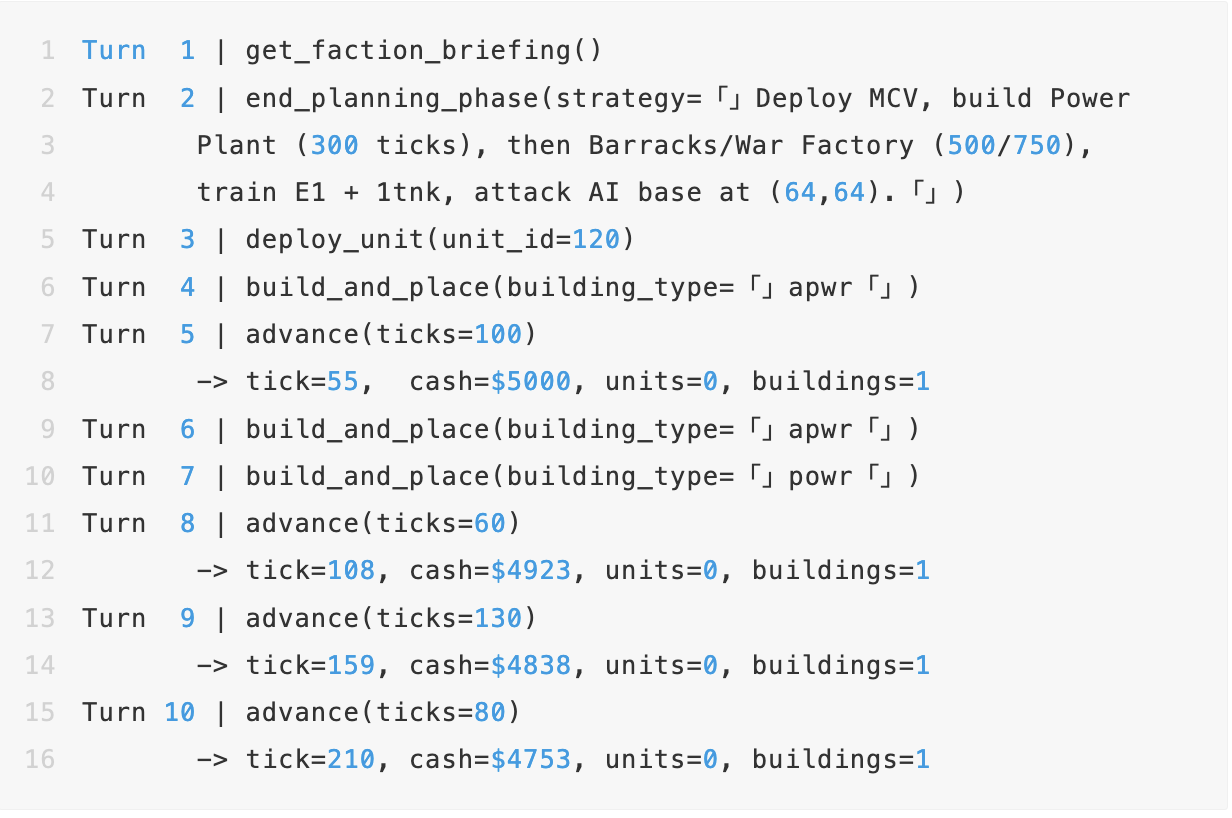 三段式节奏清晰可见:情报+规划 → 建造经济 → 用 advance 快进来弥合 LLM 推理延迟和游戏速度之间的鸿沟。