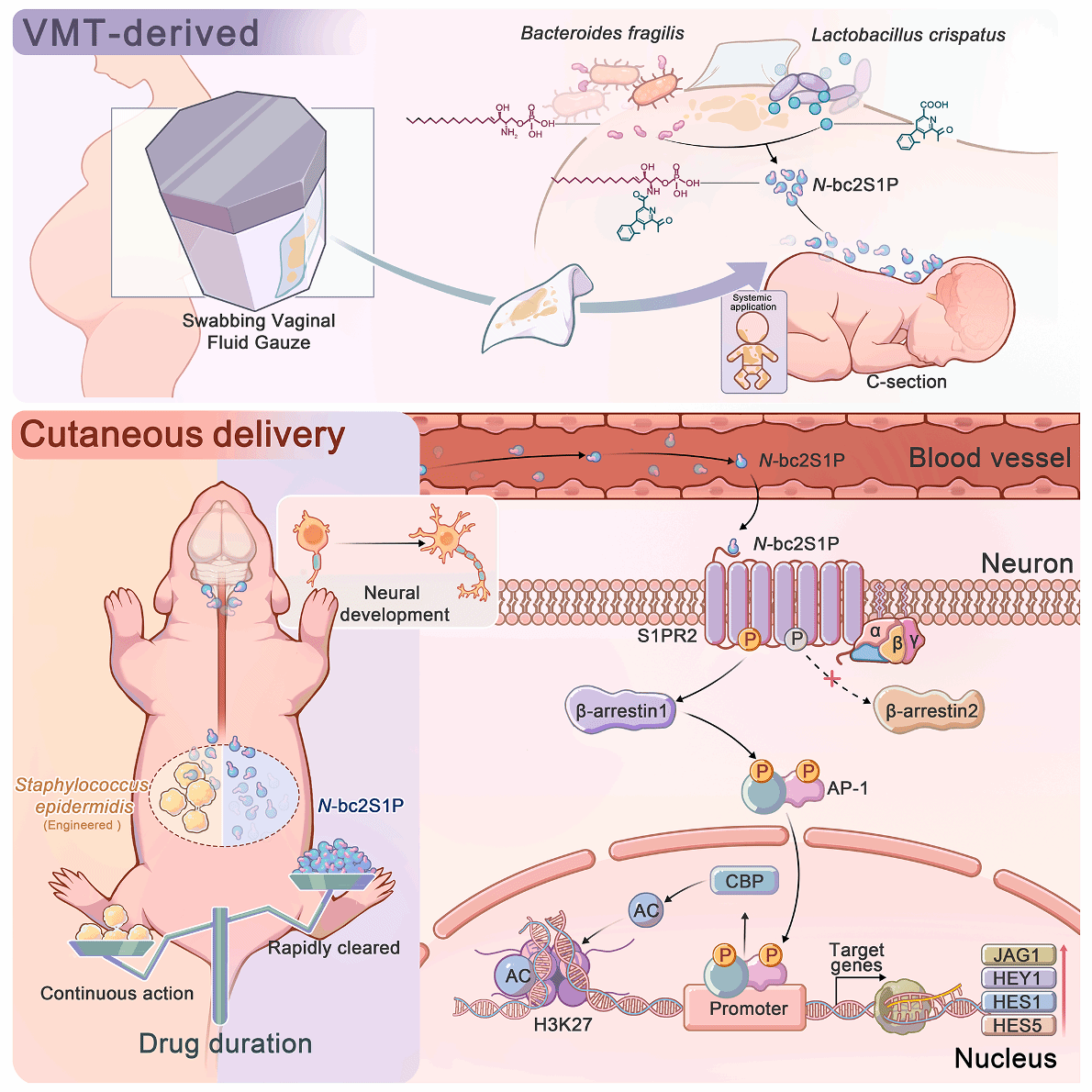 机制研究显示,N-bc2S1P并非单一菌种产生,而是由两种共生菌协同生成:卷曲乳杆菌提供β-咔啉,脆弱拟杆菌提供鞘氨醇-1-磷酸,在新生儿皮肤微环境中共同合成该分子。生成的N-bc2S1P可经皮进入体循环并到达脑组织,作用于前脑兴奋性神经元上的S1PR2受体,选择性激活β-arrestin1偏向的信号通路,进而促进AP-1/CBP复合体募集,增强Notch相关基因位点的H3K27乙酰化水平,从表观遗传层面改善剖宫产相关的早期神经发育异常。