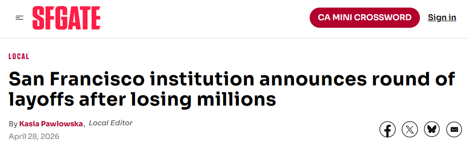 该机构执行董事Scott D. Sampson在一份与SFGATE共享的新闻稿中表示,裁员将影响53名员工,占团队的9.3%。Scott表示:“受影响的员工包括管理层、工会代表员工和非工会员工。”