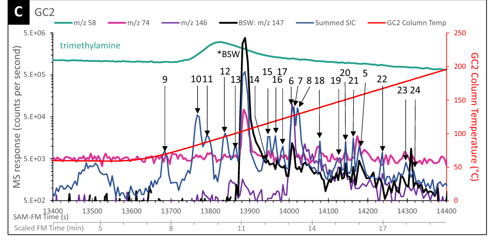 在第 2,879 个火星日,好奇号将岩粉投入含有 TMAH 的试剂杯中,在氦气流中缓慢加热至约 550°C。释放出的气体经过质谱仪和气相色谱柱精细鉴定,结果远超预期。