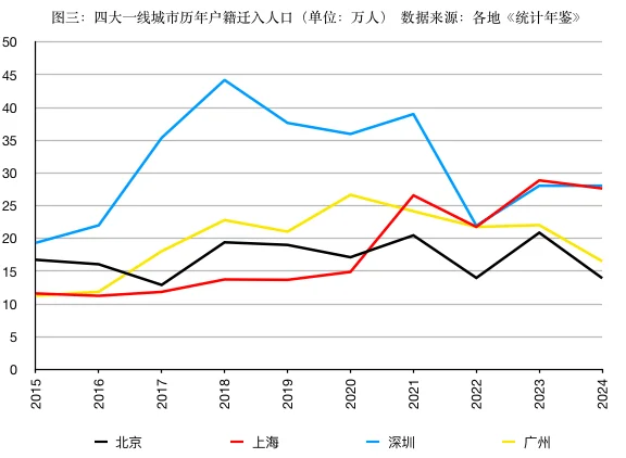 如图三,四大一线城市公布了2015—2024年的户籍迁入人口数。十年间,落户北京、广州的人数波动相对较小。其中,2024年共有13.94万人成功落户北京,为2018—2024年间的最低值;2024年共有16.52万人成功落户广州,是2017—2024年间的最低值。