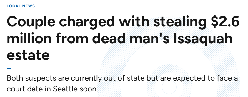 金县(King County)检察官对一对夫妇提起了诉讼,指控他们从已故Issaquah男子Michael Flegle的遗产中盗取了260万美元——他们被控使用了伪造的遗嘱、盗取资金并伪造签名。