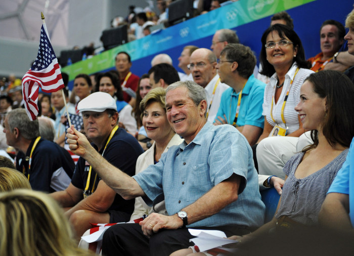 2008年北京奥运会期间,小布什与第一夫人劳拉及女儿芭芭拉在一起。Mandel NGAN/AFP/Getty Images