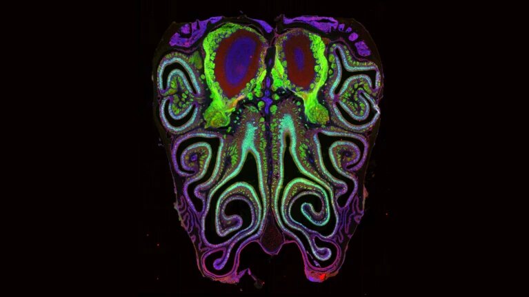 小鼠鼻腔的显微镜横截面图像,显示了鼻上皮的解剖结构。图片来源:Datta Lab