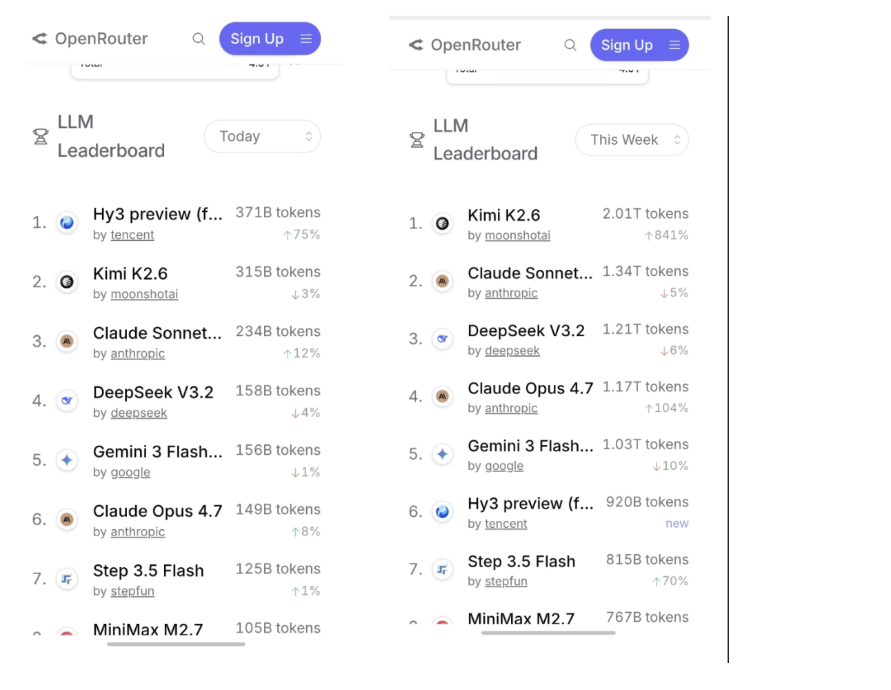 4月29日,华尔街见闻发现,OpenRouter最新的当日全球大模型 API调用量排行榜中,腾讯混元新模型 Hy3 preview 在总榜上排名第一。