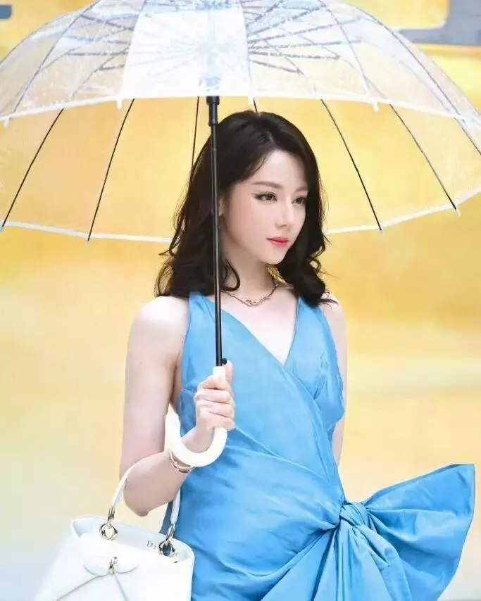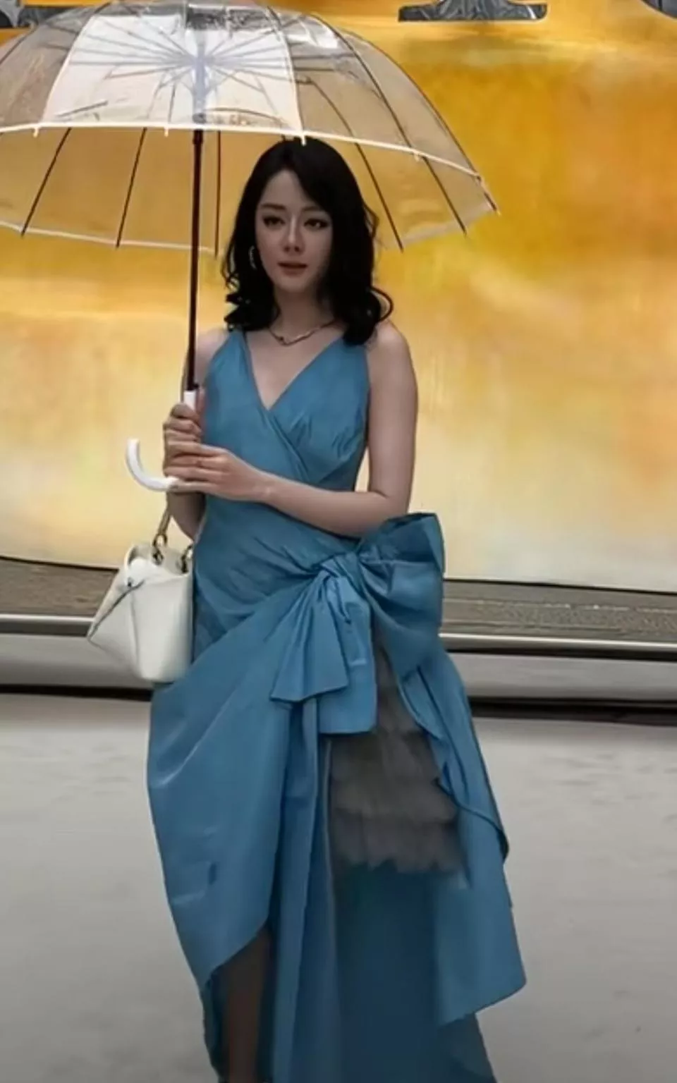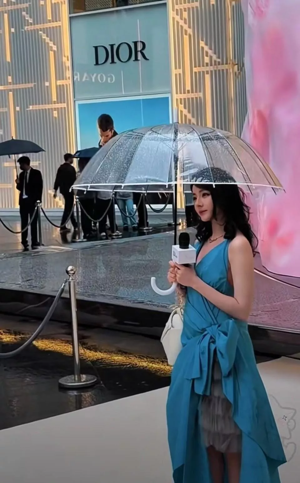 迪丽热巴身着湖蓝色长裙压轴登场,雨势渐大时,工作人员递来透明雨伞。