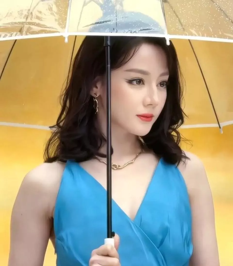 她撑伞行走,发丝微湿,侧脸在雨雾中依旧立体。