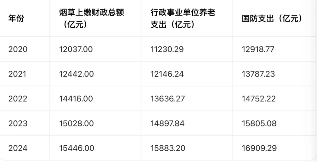 文章《烟草是世界上最糟糕的收税方式》里面提到2024年中国烟草上缴财政总额1.54万亿。写完总觉得这个数字有点眼熟,今天上午突然想起,这不正好跟财政对体制内的养老补贴差不多吗?根据财政部“2024年全国一般公共预算支出决算表”,这一年行政事业单位养老支出是15883.2亿元。然后顺手整理了一下从2020年到2024年,中国烟草上缴财政总额与行政事业单位养老支出、国防支出的金额: