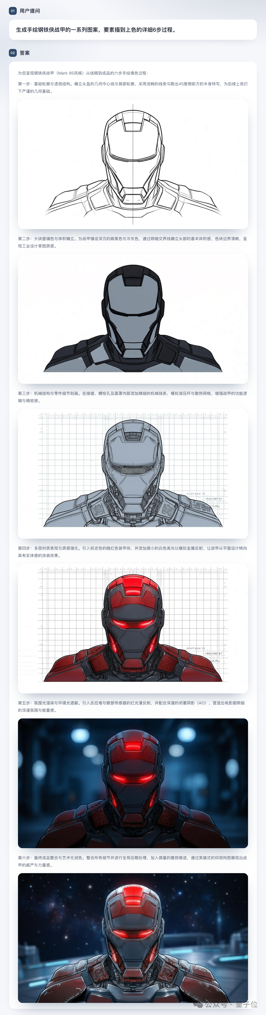 画个钢铁侠,模型也能自动从轮廓、铺色、细节、质感、氛围等多个阶段拆解完整的绘画流程。