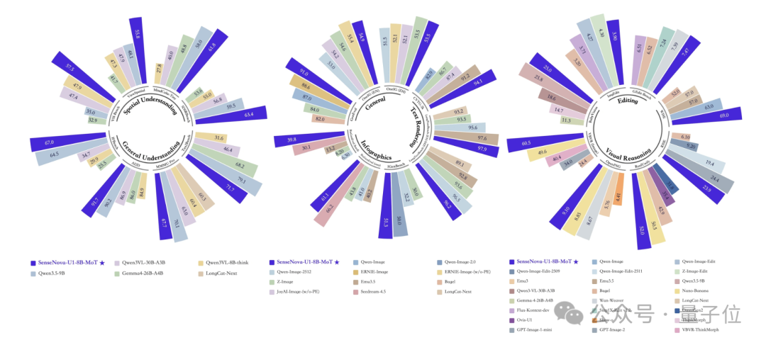 在具体的图像理解与生成的多项指标上,SenseNova-U1 也是登顶开源模型的榜首。