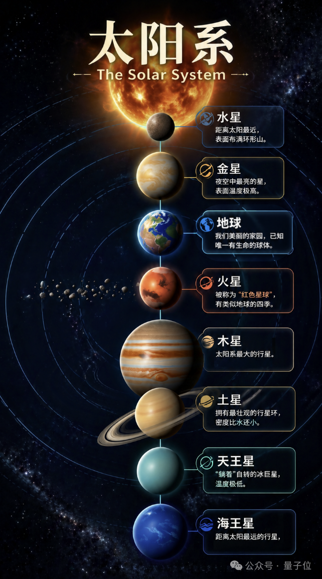 太阳系图解,八大行星各自的轨道、属性、图文介绍一应俱全,看着挺像那么回事。