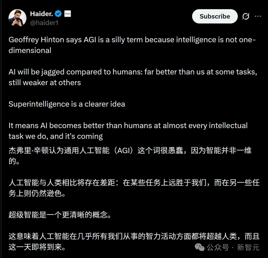 Hinton毫不留情地表示:「AGI是一个愚蠢的术语。」