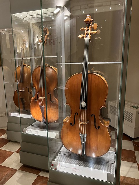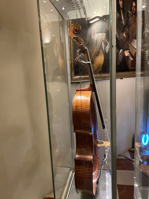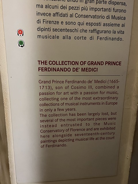 依然是2023年5月20日。学院美术馆大卫雕塑的后面还有一个小展馆。里面展示美第奇科西莫三世之子费迪南多·德·美第奇(1665–1713)的乐器收藏。注意第一把大提琴上面的白色徽章,那是美第奇家族的徽章。这把“美第奇大提琴" 出自伟大的提琴制作大师安东尼奥·斯特拉迪瓦里(Antonio Stradivari). 属于专门定制。距今已有300多年(1690年)。属于世界上最珍贵的乐器之一。