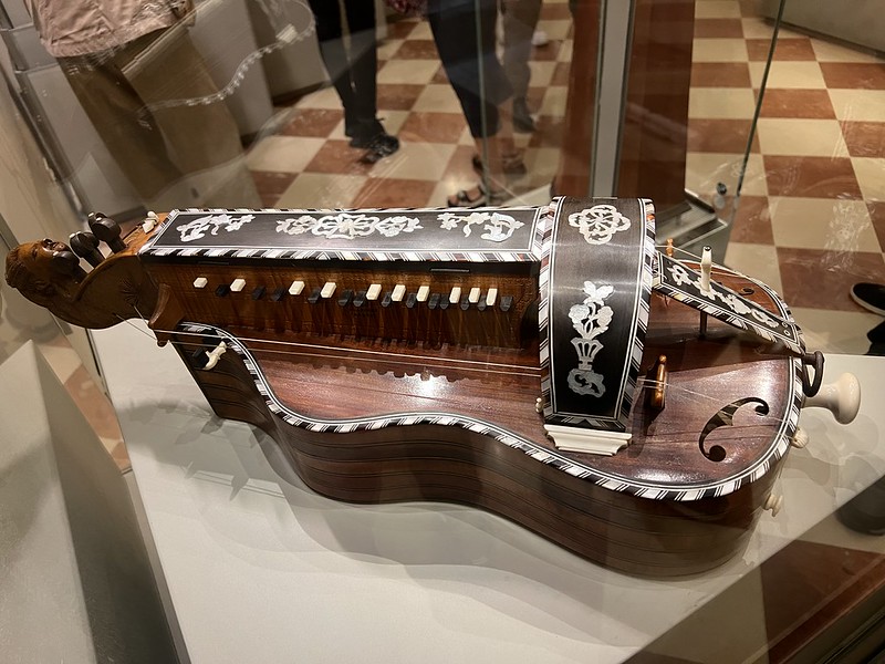 ▪︎ 手摇发声: 你在琴右端看到的那个手柄(像个小摇杆),连接着琴身内部的一个木制圆轮。演奏者转动摇杆,圆轮摩擦琴弦,起到类似“琴弓”的作用。