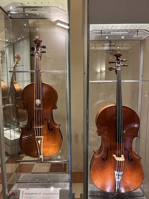 这组琴(包括右边那把小一点的中提琴和大提琴)在 1690 年由斯特拉迪瓦里交付给费迪南多大王子时,是一整套“美第奇五重奏”。