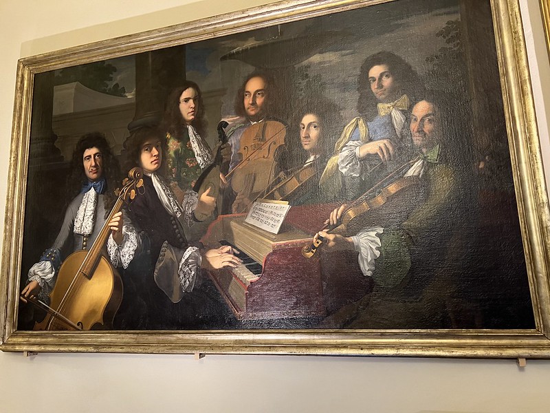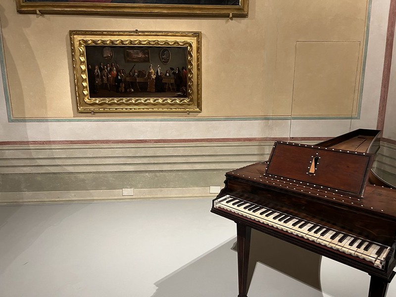 我当时拍下第一张照片后就给亮发过去,因为是大提琴啊。下面这幅画坐在那里弹奏键琴的艺术家就是费迪南多大王子本人。他不仅仅是收藏家也是音乐家。这幅画画于17世纪末期。里面的羽管键琴就是现在钢琴的前身。