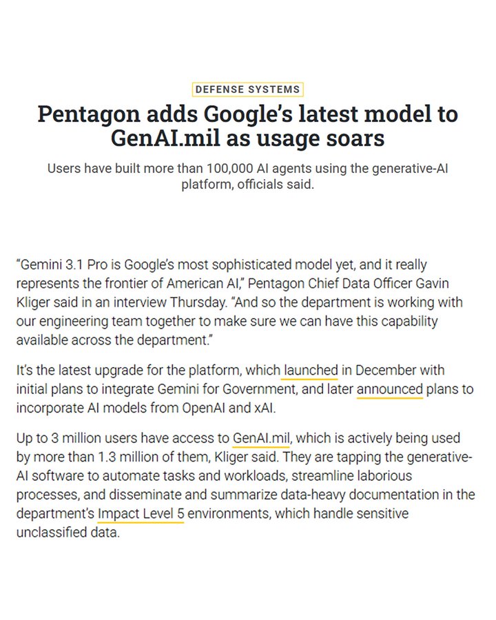 据一名熟悉交易内容的美国官员透露,五角大楼已与谷歌达成协议,国防部未来将在机密网络中部署谷歌最新的Gemini人工智能系统。目前,这份新合同的金额、期限及具体应用范围尚未公开。这意味着,在OpenAI、xAI等企业之后,谷歌也正式加入美国军方核心人工智能供应商行列。