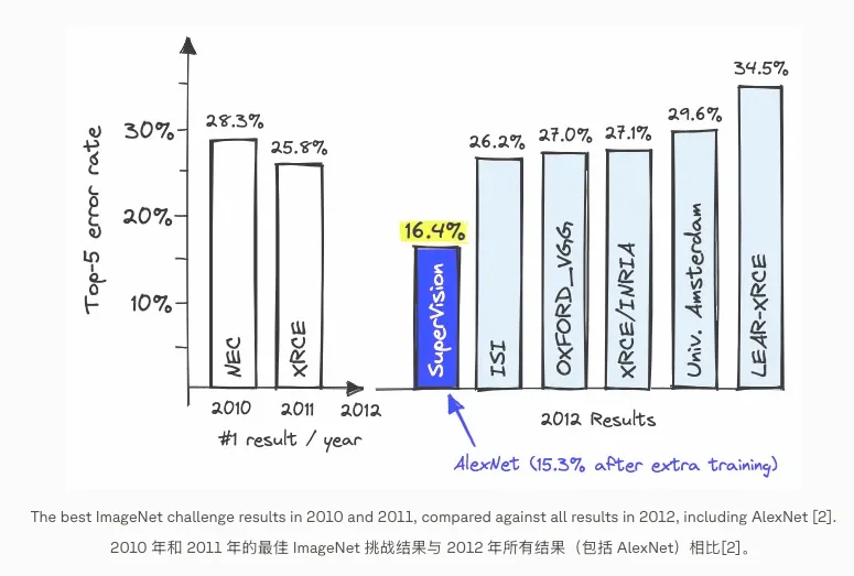 2012 年的 ImageNet 大赛上,图灵奖得主 Hinton 带领的小队打出了遥遥领先的战绩。