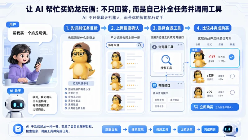 举个例子,我们让 AI 来帮我们去买个奶龙玩偶,那 AI 最先做的,就是搞清楚,什么是奶龙?