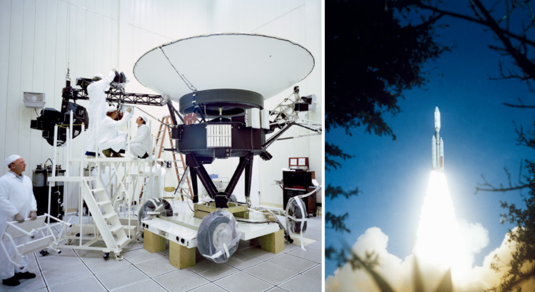 起飞前,“旅行者” 2 号在美国航空航天局喷气推进实验室进行测试(左图)。这架航天器于 1977 年 8 月 20 日升空。(图片来源:JPL-Caltech/NASA)