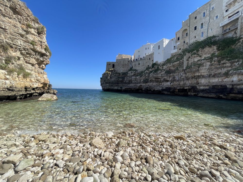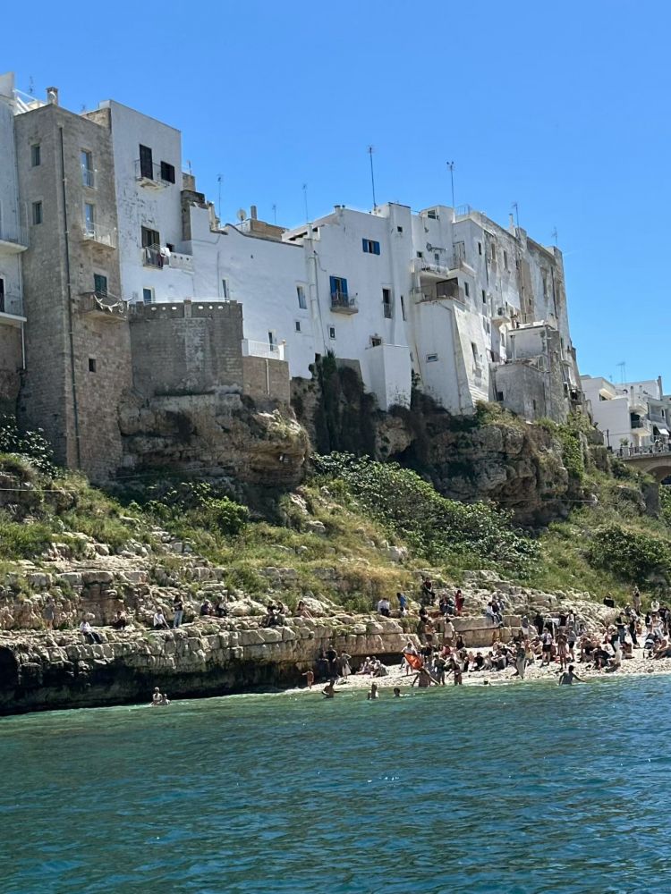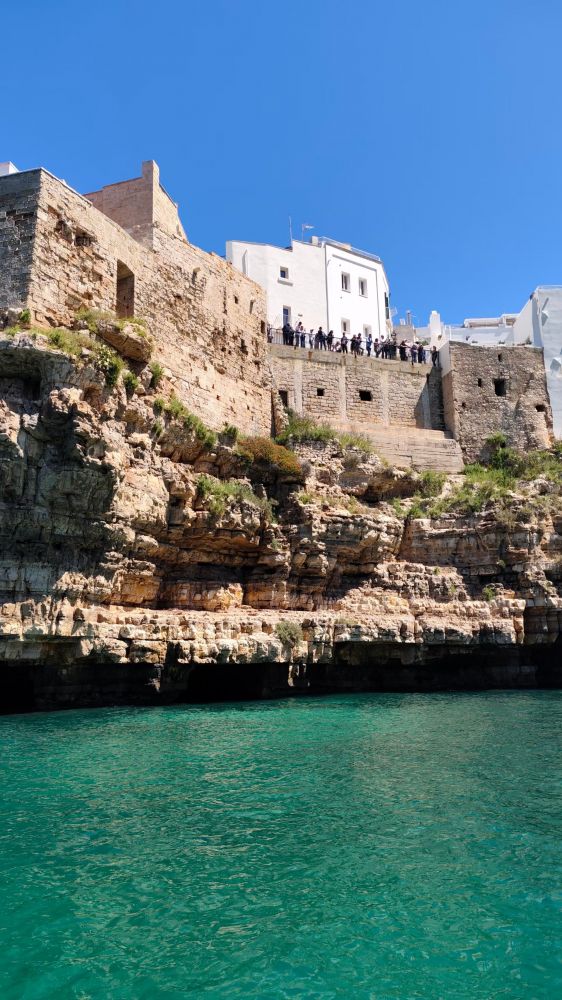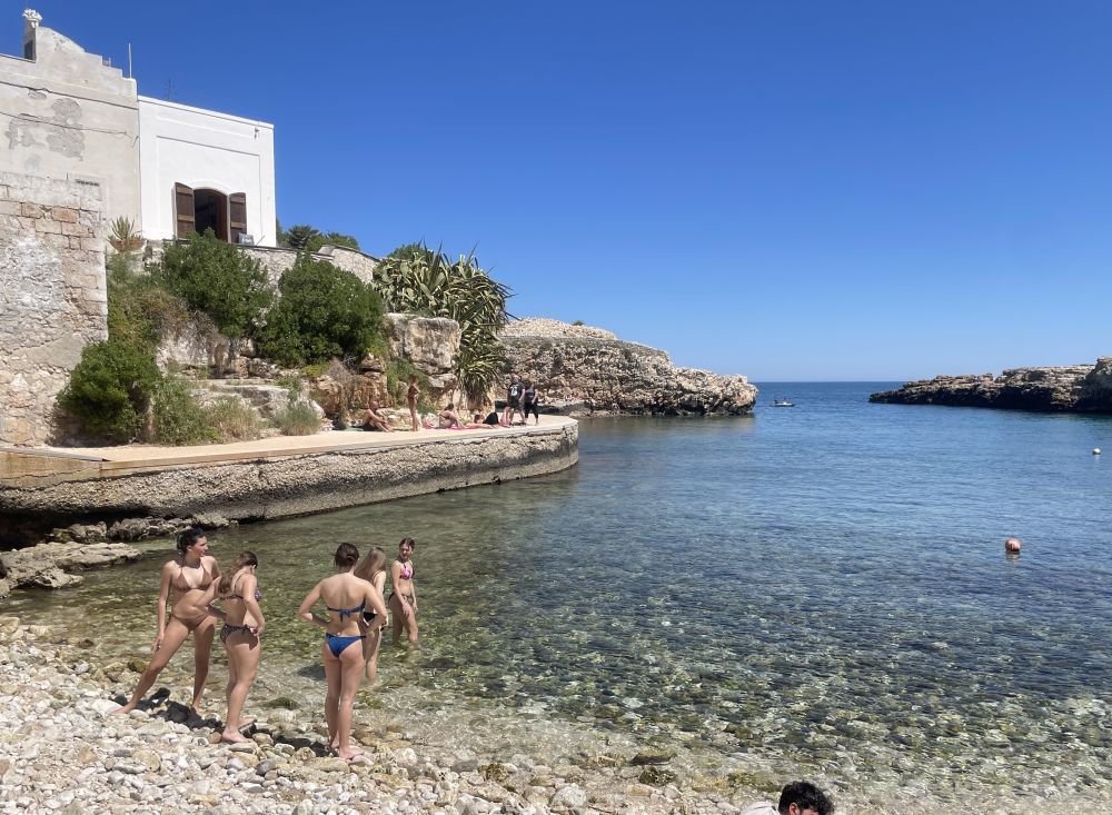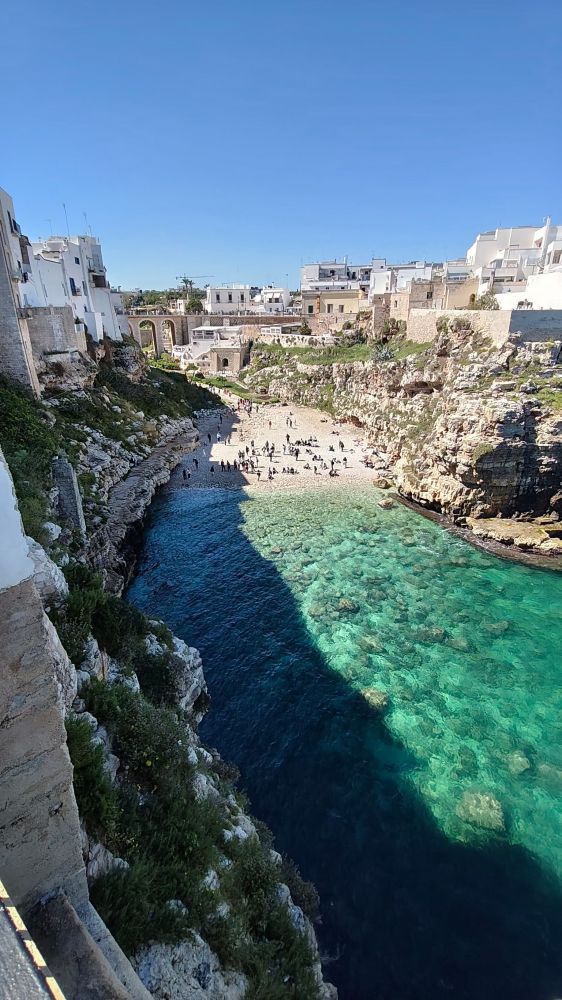 石灰岩悬崖、狭窄海湾、清楚澈海水,这里非常适合悬崖跳水。红牛悬崖跳水世界系列赛,一个非常有名的悬崖跳水比赛,通常会在波利尼亚诺阿马雷举行。选手会从大约20–27米高的悬崖或平台直接跳入海里,不是普通泳池跳水,而是“极限版”。虽然现在是4月份,海水已经相当温和。海水中和沙滩上不少人,不是只有美国海滩上常见那些肥胖的大叔大婶,而是年轻的帅哥美女。美丽的春天,春光无限。有点后悔没带游泳裤。