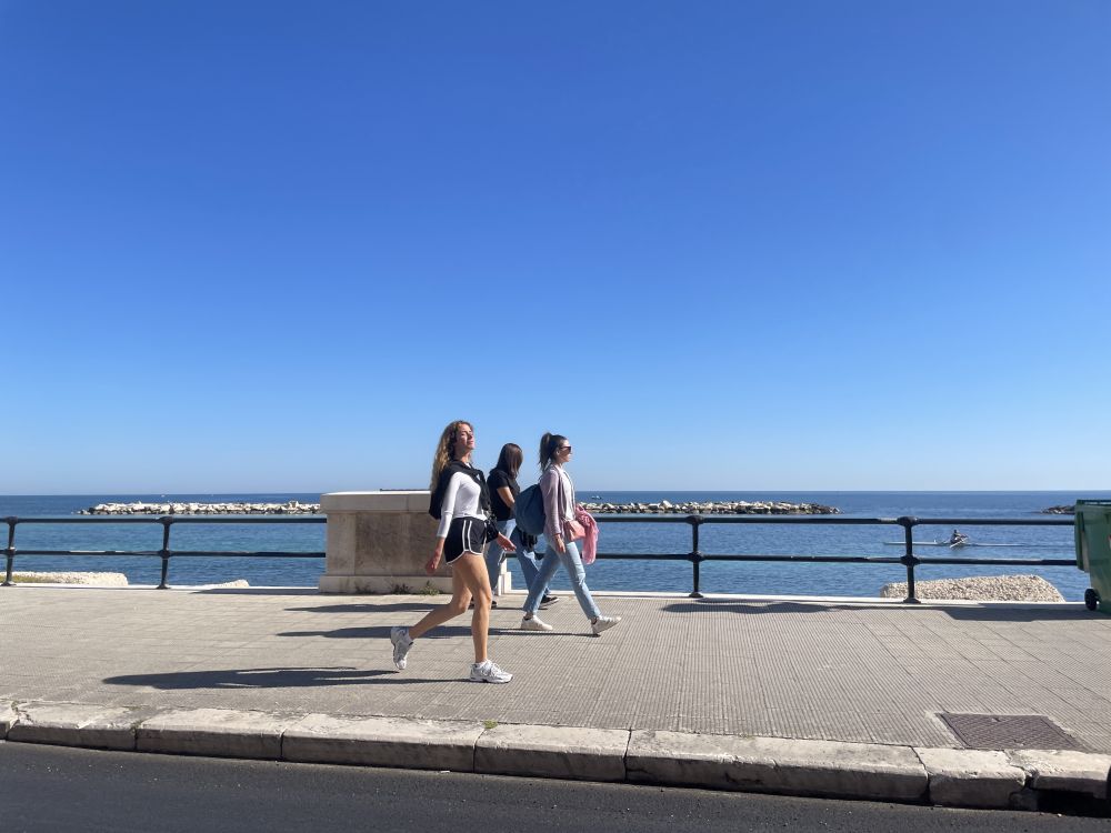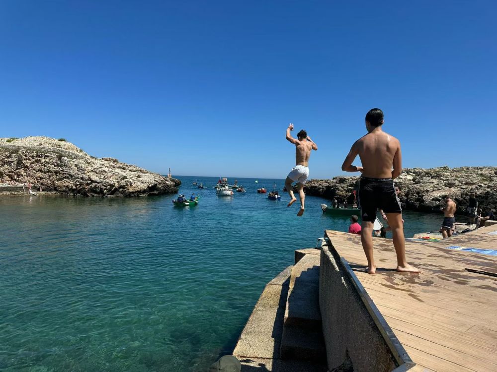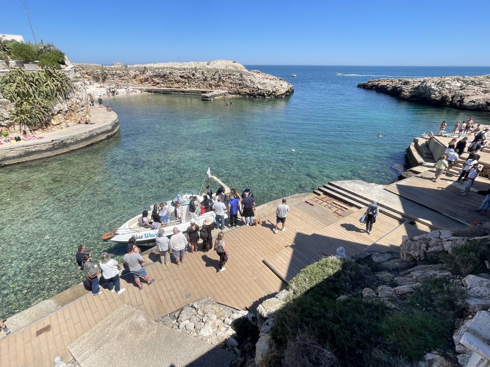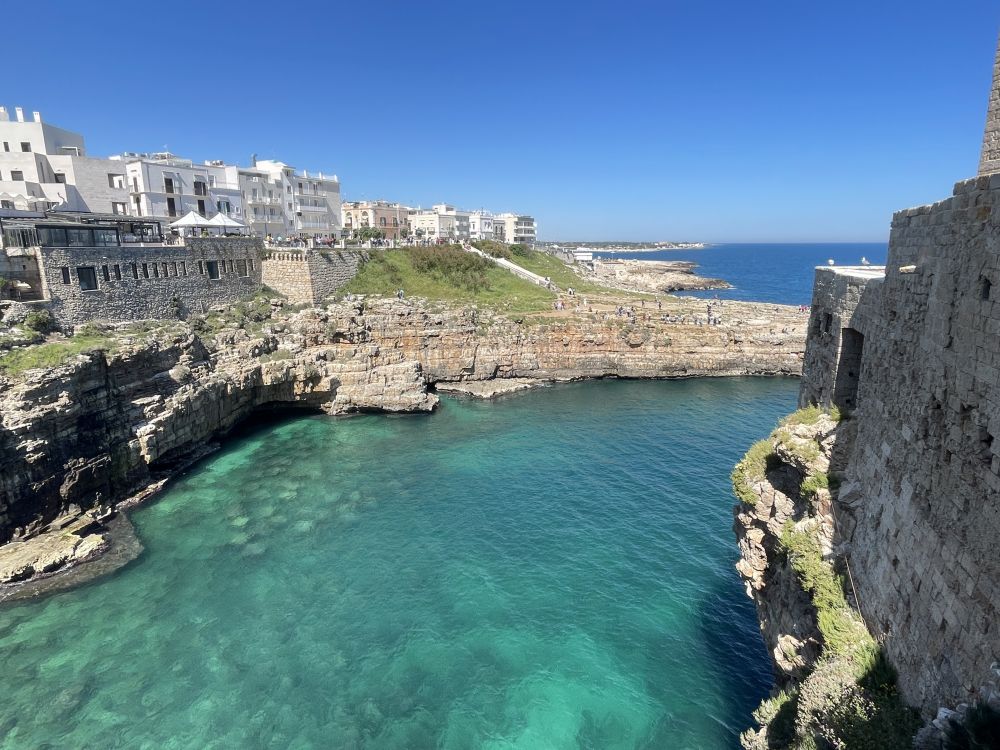 石灰岩悬崖、狭窄海湾、清楚澈海水,这里非常适合悬崖跳水。红牛悬崖跳水世界系列赛,一个非常有名的悬崖跳水比赛,通常会在波利尼亚诺阿马雷举行。选手会从大约20–27米高的悬崖或平台直接跳入海里,不是普通泳池跳水,而是“极限版”。虽然现在是4月份,海水已经相当温和。海水中和沙滩上不少人,不是只有美国海滩上常见那些肥胖的大叔大婶,而是年轻的帅哥美女。美丽的春天,春光无限。有点后悔没带游泳裤。
