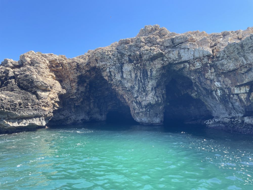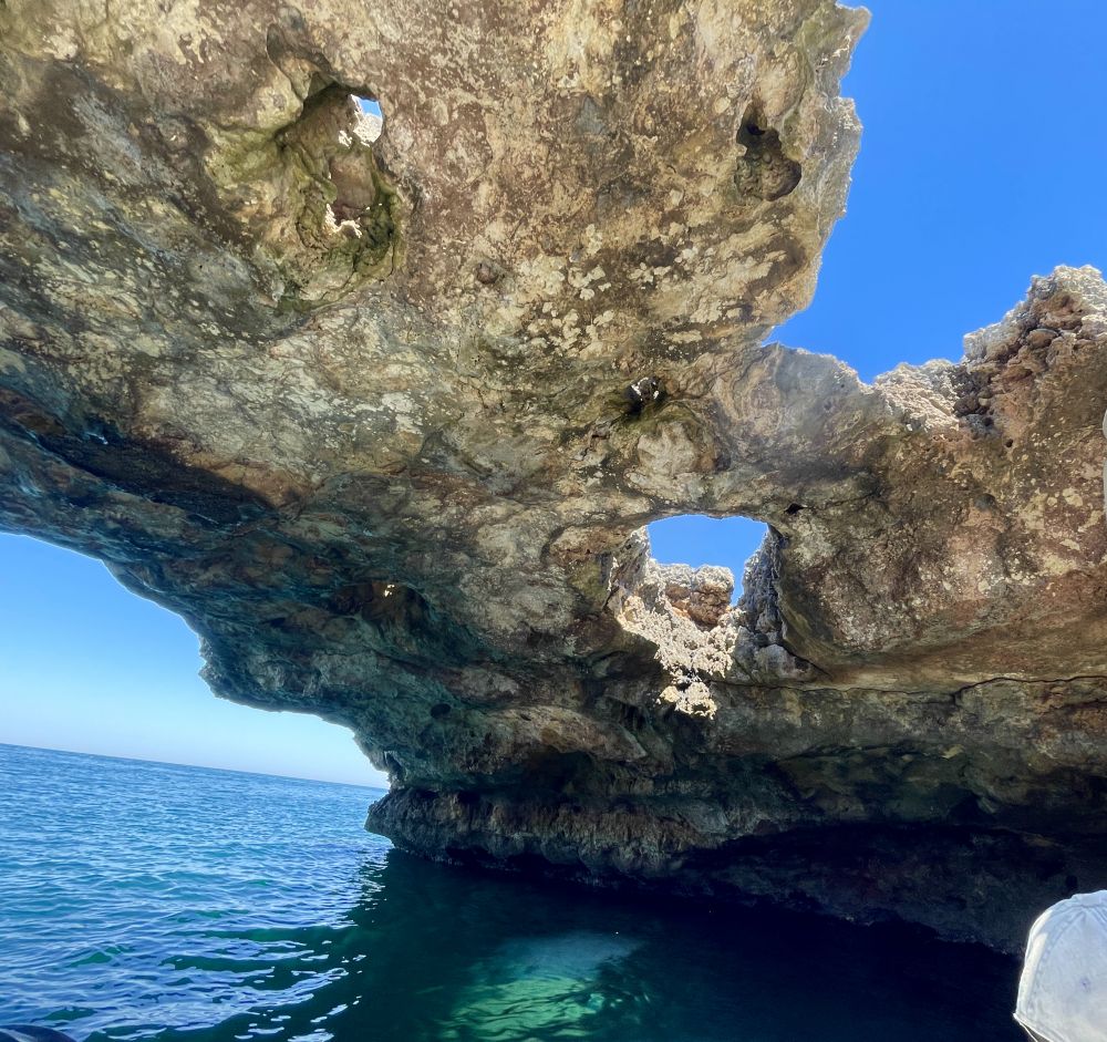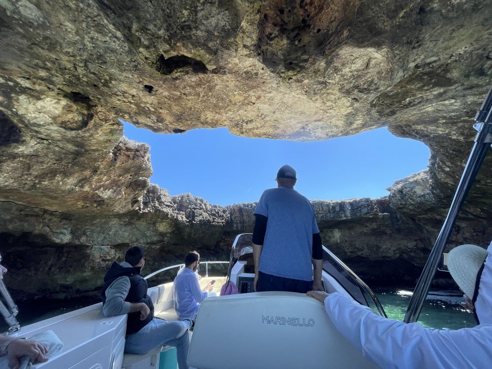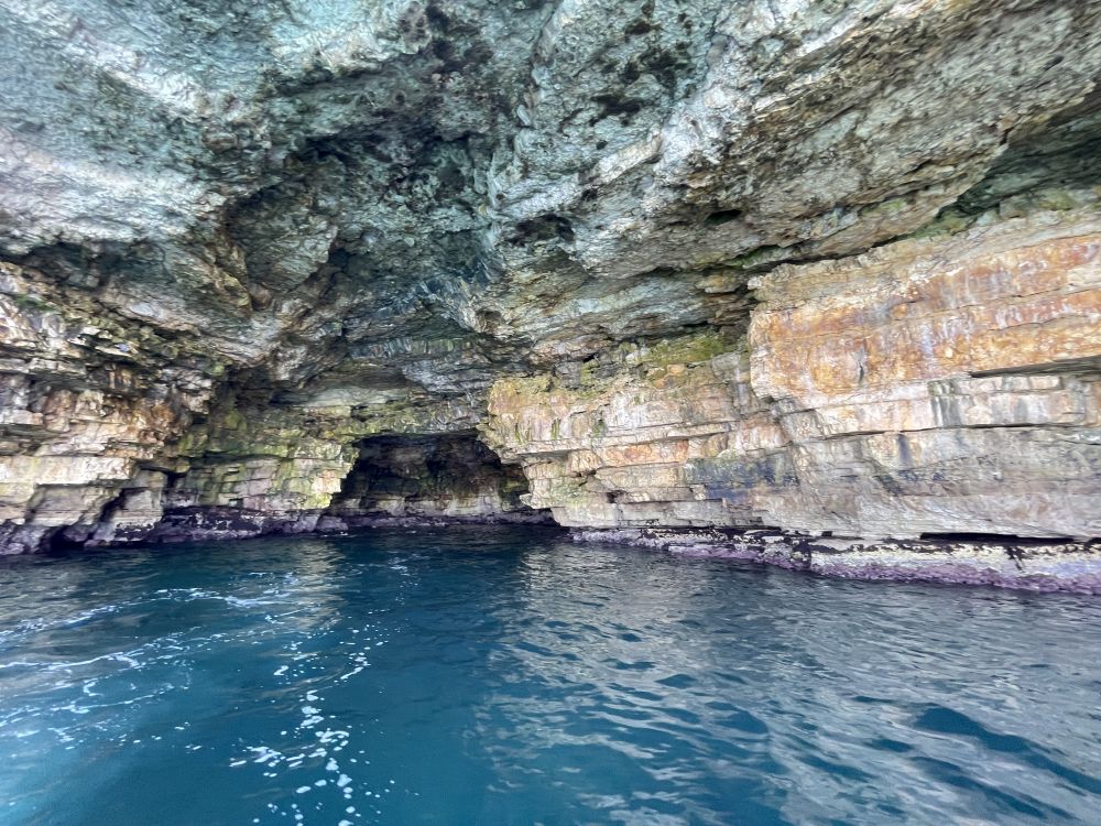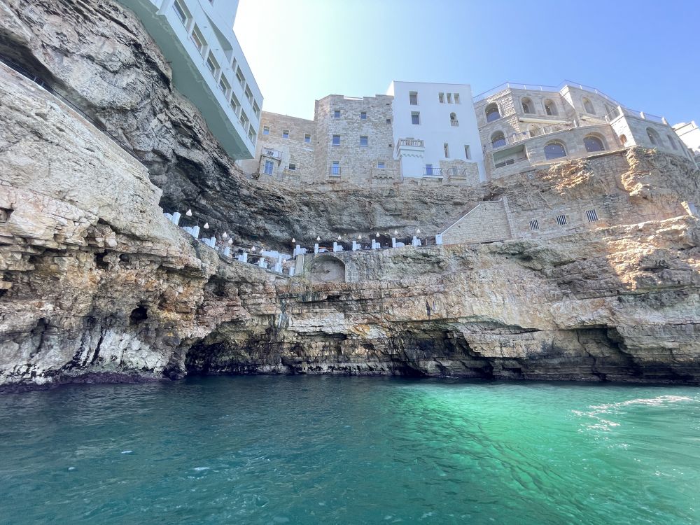 无论站在悬崖边、石桥上,还是卵石滩前,海景都十分迷人。最有特色的旅游活动是乘小艇出海探海蚀洞。我们乘小艇出海沿崖而行,看到岩壁下的不少海蚀洞穴。有些洞穴比较深,里面有小沙滩、有"天窗",有另一出口。这里也有一个“蓝洞”,虽然不及卡普里岛的蓝洞那样惊艳,比较开敞,但依然别致。最引人注目的是半悬在海崖洞穴中的餐厅Grotta Palazzese。洞口面向大海,据说是意大利最独特、也最昂贵的餐厅之一。从海上小艇上仰望,洞中灯光与崖壁相映,别有一番趣味。小艇船长身材健美,看起来60多岁,他却声称75岁,曾经在纽约皇后区住多年,后来回家乡开小艇。喝酒、吃橄榄、晒太阳,无忧无虑。取笑我们应多来意大利海边,长寿。