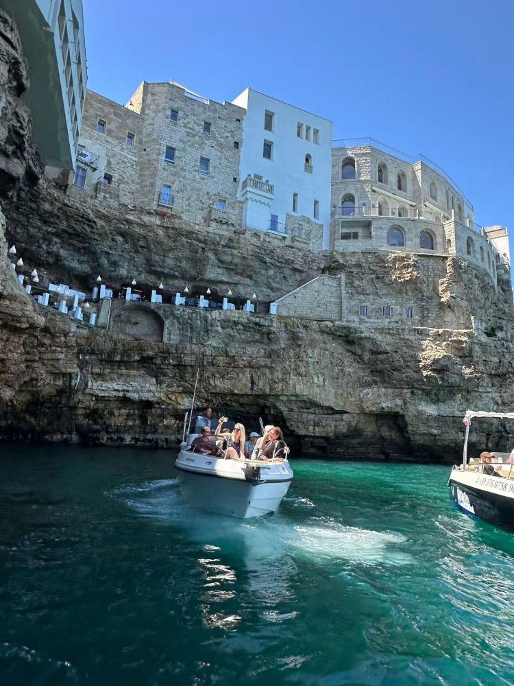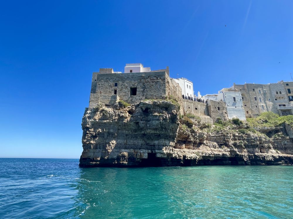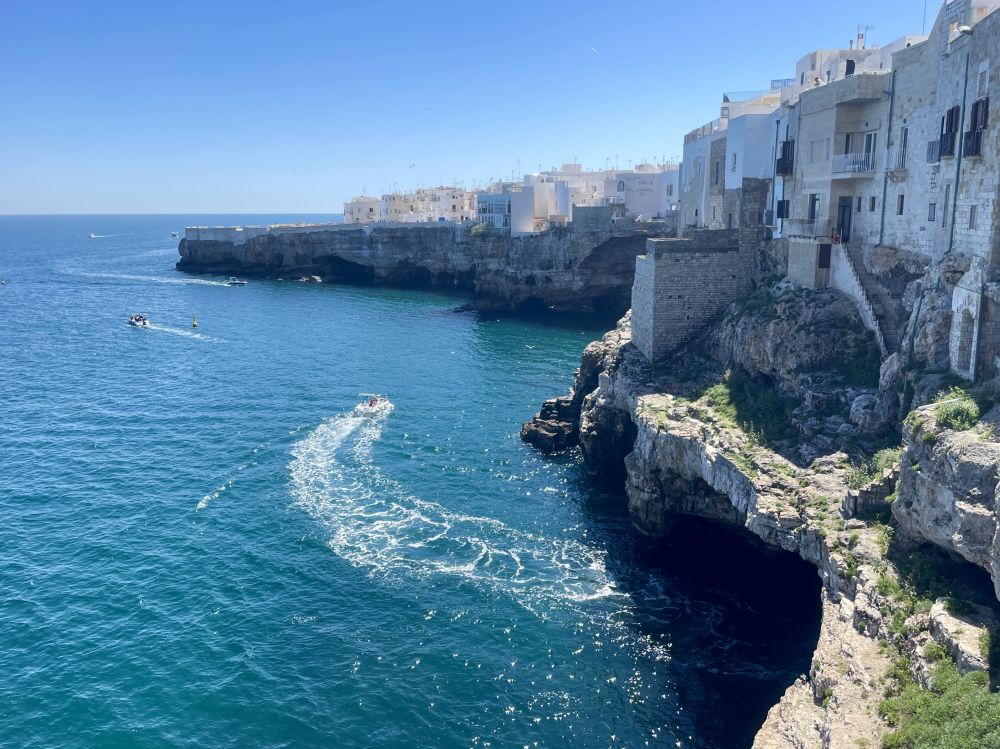 滨海小镇波利尼亚诺阿马雷Polignano a Mare,面向亚得里亚海,"生长"在十几米高的石灰岩悬崖之上。海浪长期侵蚀,使海岸线布满洞穴与裂口,一些裂谷中形成小小卵石滩,人们悠闲地晒太阳、游泳。约2500年前,希腊人在这片易守难攻的岩崖上设立补给据点,供过往船只停靠休整。由于缺乏天然深水港,这里始终只是小镇,也因此保留了一种松散悠闲的生活节奏。
