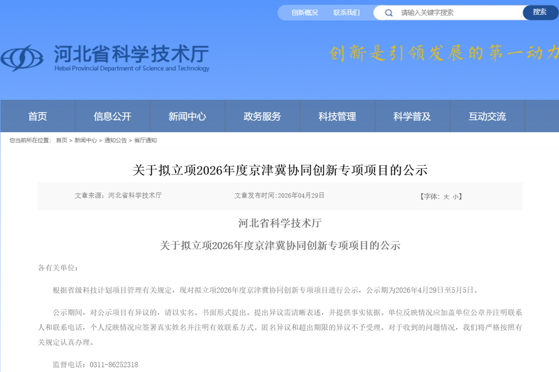 根据省级科技计划项目管理有关规定,现对拟立项2026年度京津冀协同创新专项项目进行公示,公示期为2026年4月29日至5月5日。