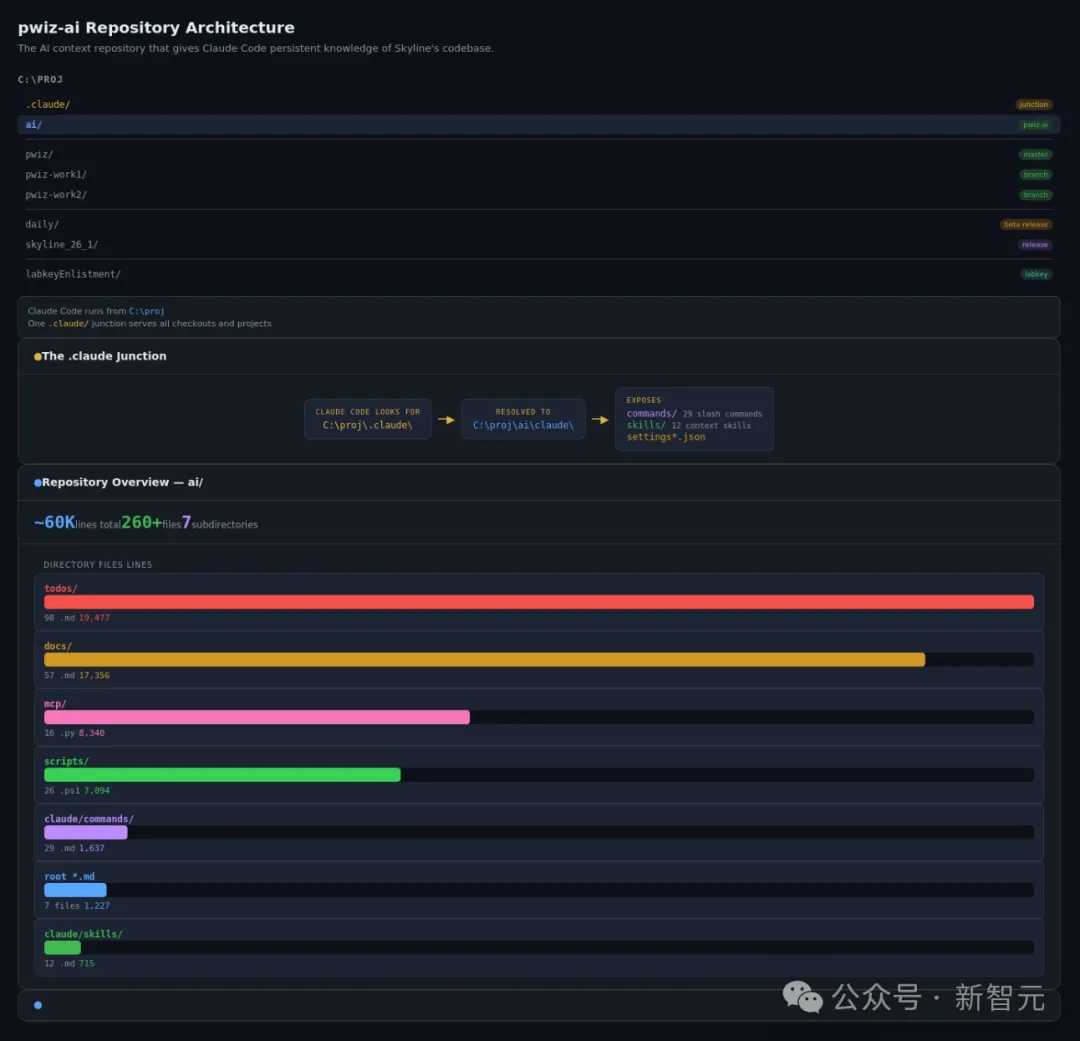 具体来说,他建了一个独立的代码仓库叫pwiz-ai,专门存放给AI看的上下文,和主代码库完全分开。根目录下的CLAUDE.md是「地形图」,告诉Claude项目的结构、编译方式、测试流程。