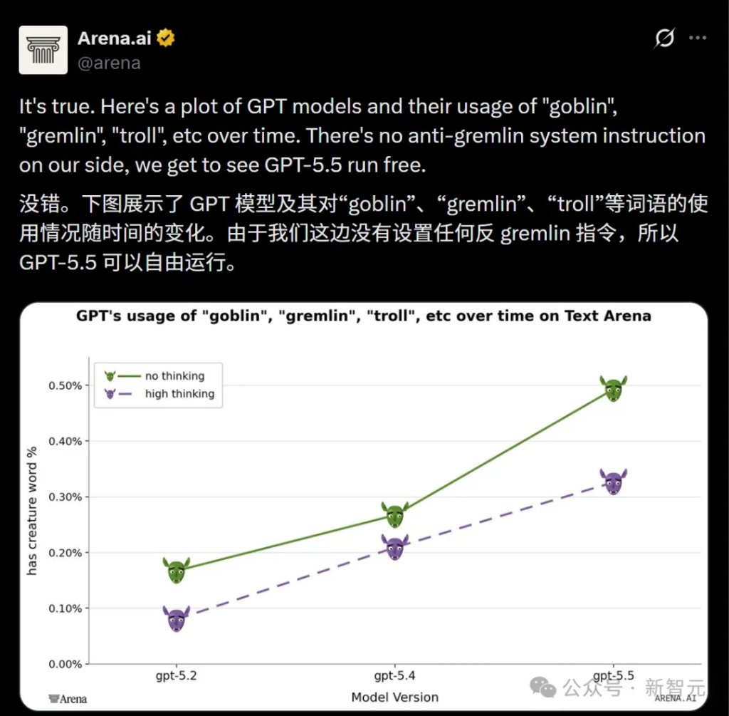AI评测网站Arena.ai的数据确认,GPT-5.5使用goblin、gremlin、troll的频率出现了统计学意义上的明显上升。