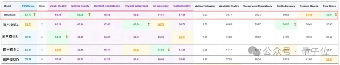 EWM Score是这个榜单的综合评分,Motion Quality、Flow Score、Motion Smoothness这些维度分别考察动作的真实性、连续性和平滑度。