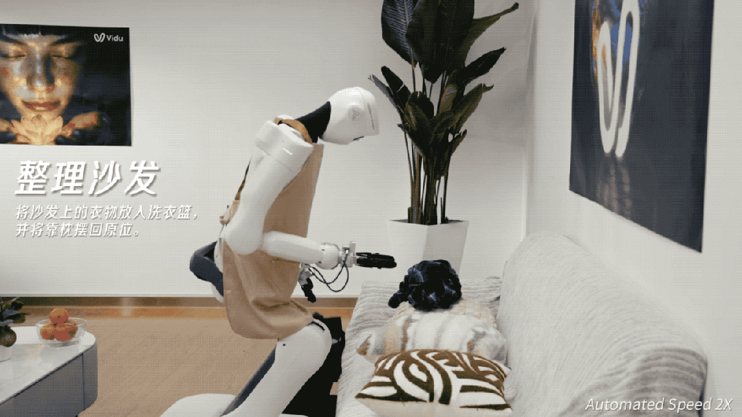 也能看到它精准识别出散落的衣物和错位的靠枕,先将衣物逐一拾起、规整放入洗衣篮,再将歪歪扭扭的靠枕摆回原位。