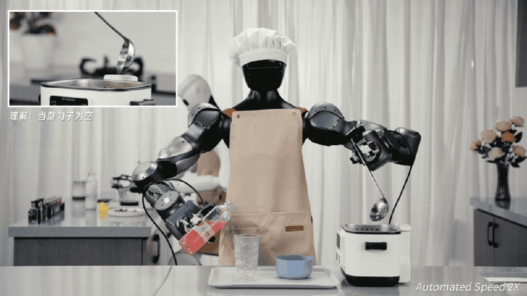 别小瞧这个不起眼的动作,需要机器人「理解」勺子是空的,同时能自主「预测」并重新执行捞取动作。